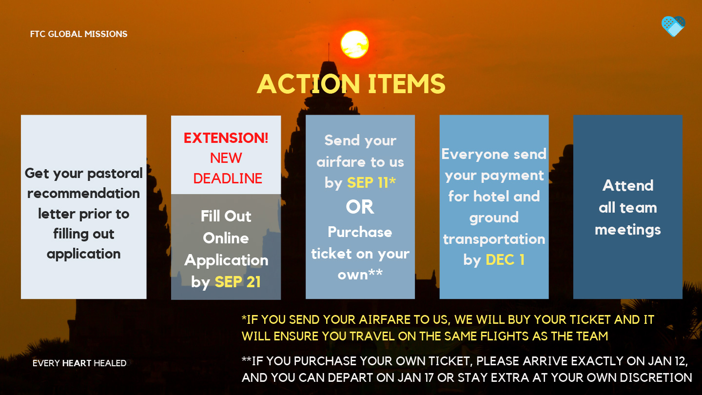 FTC currently has four Cambodian pastors who were baptized and trained by Missionary Domingo Carlos when he and his family planted the church there starting in 2012. FTC is looking for team members to go and be the hands and feet of Christ, to strengthen and encourage the current Cambodian leaders, and bring healing and salvation to its people.