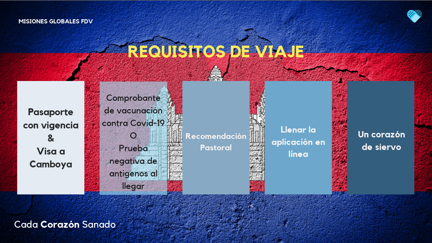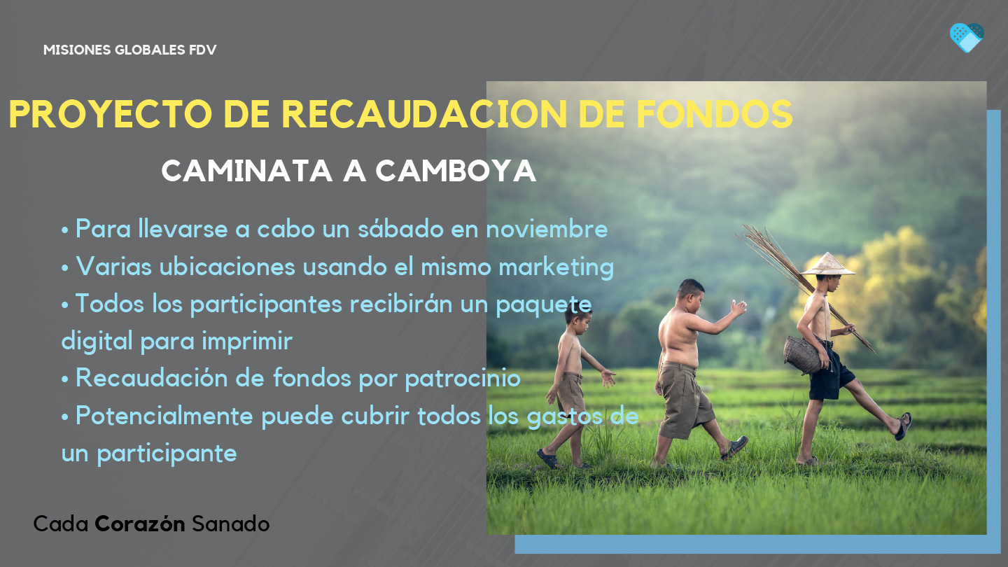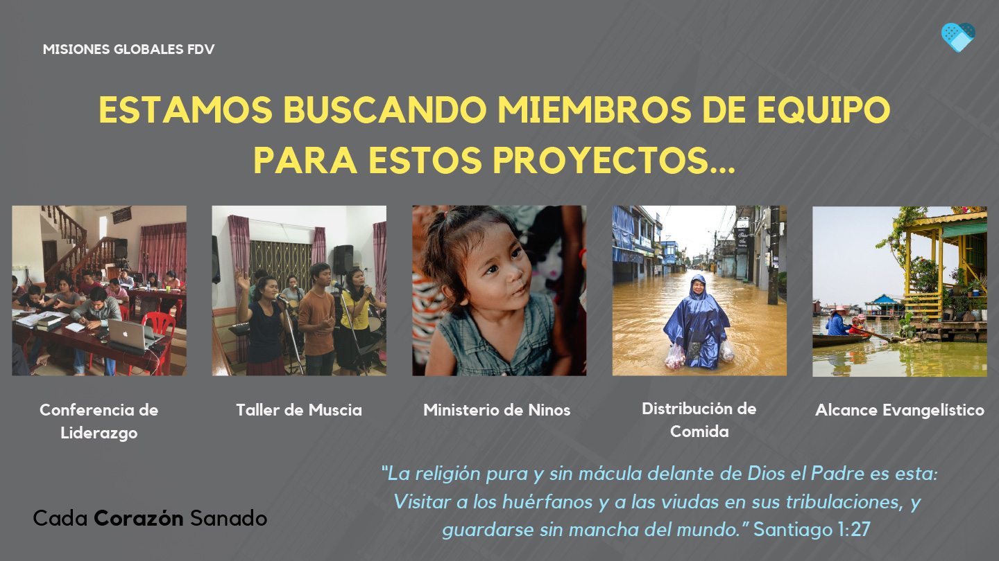 FDV actualmente tiene cuatro pastores camboyanos que fueron bautizados y capacitados por el misionero Domingo Carlos cuando él y su familia plantaron la iglesia allí a partir de 2012. FDV está buscando miembros del equipo misionero para ir y ser las manos y los pies de Cristo, para fortalecer y animar a los líderes camboyanos actuales, y llevar sanidad y salvación a su gente.