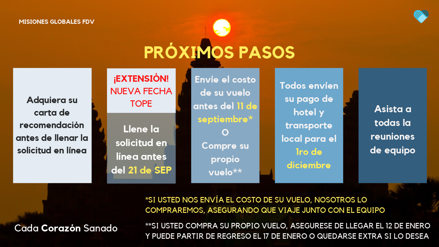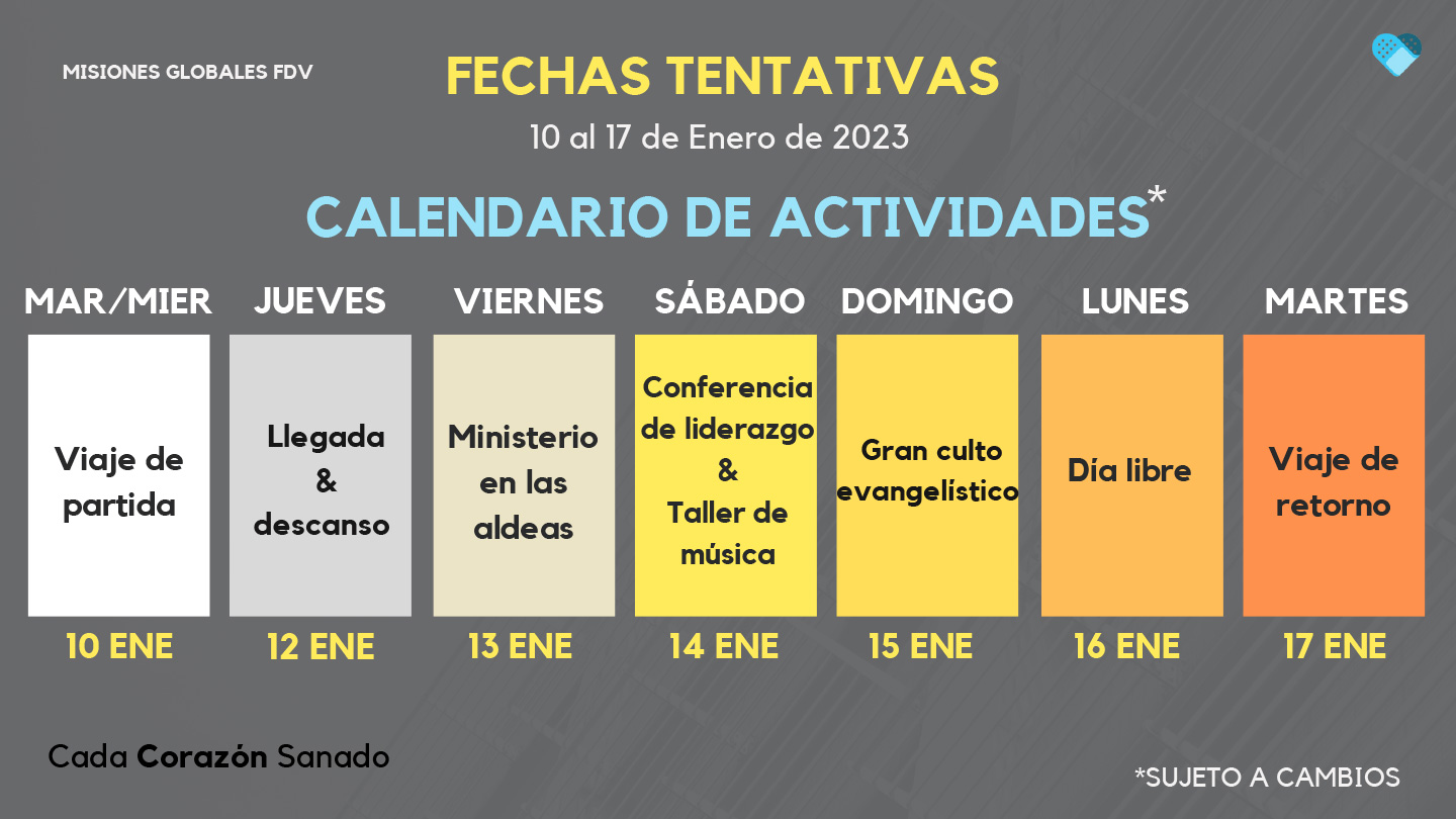 Participar en este viaje extraordinario será una experiencia que cambiará tu vida y te dejará recuerdos inolvidables, transformará profundamente tu perspectiva y te permitirá ver cosas que nunca imaginaste, y tendrás la oportunidad de impactar a nuestras iglesias FDV de maneras significativas.